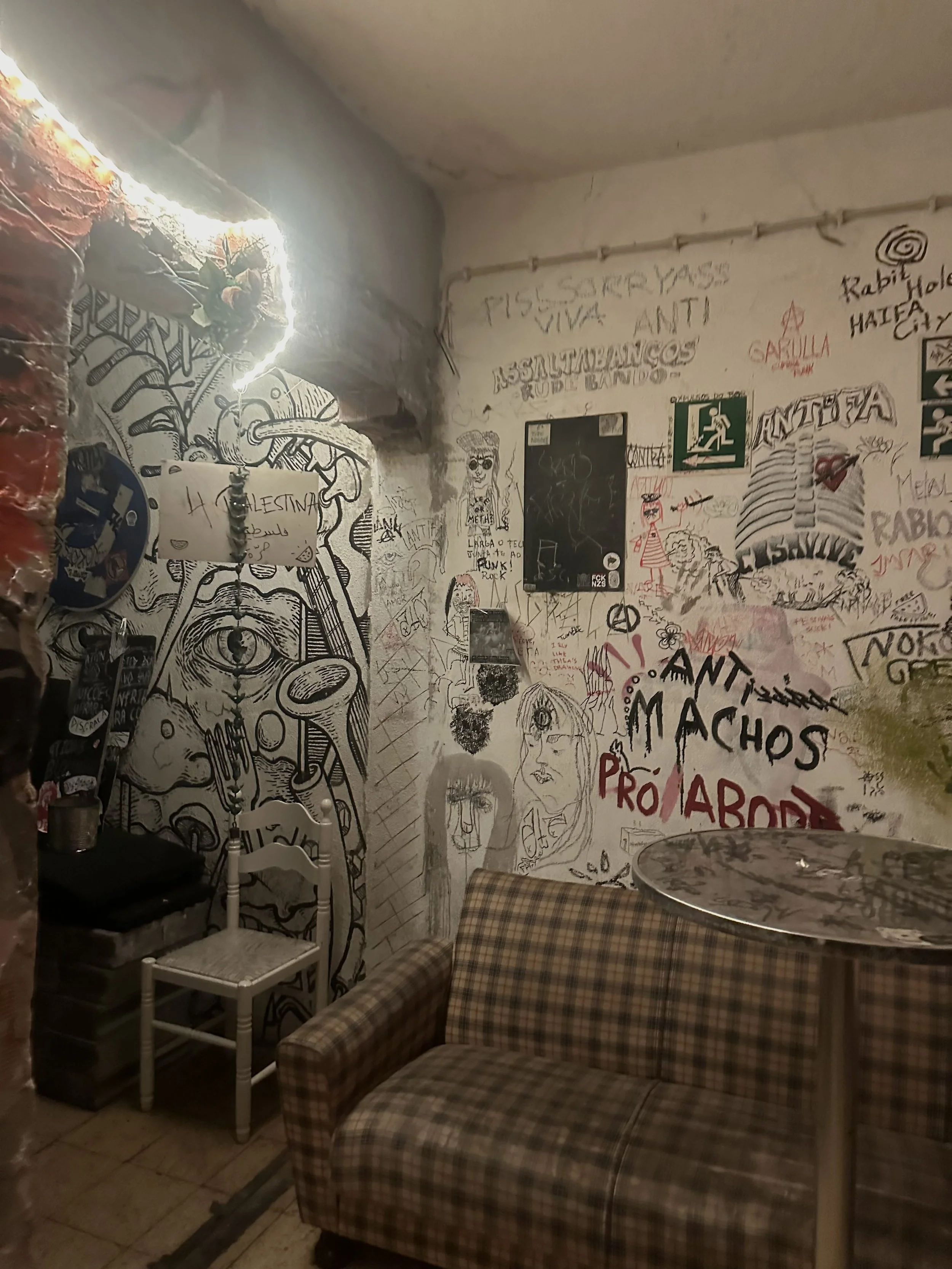 The tour continued. On the edge of the common area was a table filled with shirts, patches, prints and zines, all created by members of Disgraça and sold to raise funds to contribute back to the space. It becomes hard, here, to recall the layout of the centre. There were too many claustrophobic staircases, too many cave-like hallways, and somehow, it felt like we never stopped descending deeper into the ground. I heard a couple members refer to these underground rooms as ‘the catacombs’. It seemed as though Disgraça had a room for every possible hobby; there was a concert hall, a rehearsal space, a space for screenprinting, and a gym, among many, many other multipurpose spaces, all coated in antifa stickers, doodles and leftist slogans.